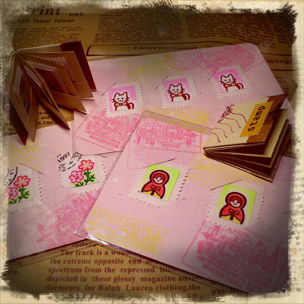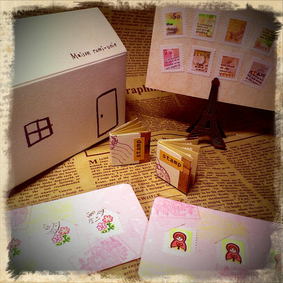 写真と文字をコラージュしたデザイン切手が8枚入った豆本と、ワンポイントイラストの入ったミニ切手。