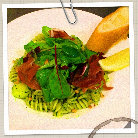 ほうれん草とバジルのペーストをパスタにからめてサラダを盛った、見た目からして豪華な一品。