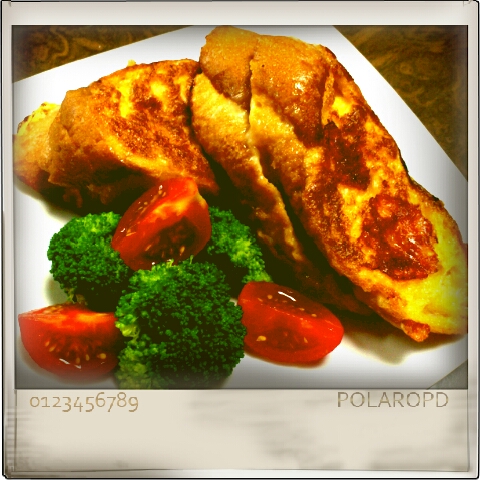 職場で穴大きくて使えないバゲットをもらったので、間にチーズとベーコンをはさんで、甘くないフレンチトースト作りました。