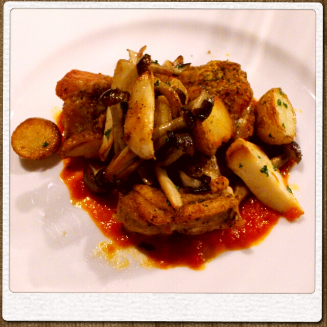 鶏もも肉のグリル、キノコとじゃがいもを添えて。