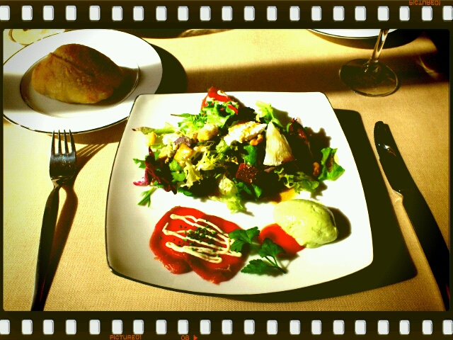 牛肉のカルパッチョ、アボカドムース、3種のチーズサラダ。