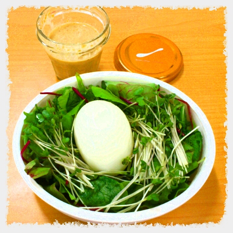 味付けはゴマドレッシングを瓶で。